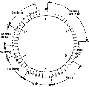 Während jeder Minute werden die Nummern von Minute, Stunde, Tag, Wochentag, Monat und Jahr BCD-kodiert durch Impulsdauermodulation der Sekundenmarken übertragen. Dieses "Telegramm" gilt jeweils für die folgende Minute. Dabei entsprechen Sekundenmarken mit einer Dauer von 100 ms der binären Null und solche mit einer Dauer von 200 ms der binären Eins. Die Zuordnung der einzelnen Sekundenmarken auf die übertragene Zeitinformation zeigt das Kodierschema. Die drei Prüfbits P1, P2 und P3 ergänzen jeweils die vorhergehenden Informationswörter (7 Bits für die Minute, 6 Bits für die Stunde und 22 Bits für das Datum, einschließlich Nummer des Wochentages) auf eine gerade Anzahl von Einsen.