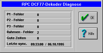 : Zeigt an, wann die letzte Synchronisierung der PC-Uhr erfolgt ist. Ab diesem Punkt ist die Ganggenauigkeit der PC-Uhr in der Regel besser als eine Sekunde, vorausgesetzt der Empfang ist ungestört.Es kann sein, daß trotz guter Empfangstelegramme keine Synchronisation der PC-Uhr stattfindet. In diesem Fall sind die Empfangstelegramme der Plausibilitätsprüfung zum Opfer gefallen. Erscheint die DCF77-Zeit nicht plausibel, wird angenommen, daß z.B. durch unglückliche Umstände die Paritäts- und Rahmenfehlerprüfung gut ausgefallen ist, aber die Zeit aufgrund einer geraden Anzahl Paritätsfehlern im selben Prüfsegment nicht stimmen kann. Zur Sicherheit wird die PC-Uhr nicht nachgestellt (synchronisiert).